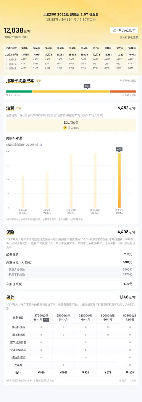 同时根据估算,坦克300 2021款 越野版 2.0T 征服者的用车成本也较高,因为同级车的最低用车成本是5467元/年,最高是13636元/年,坦克300 2021款 越野版 2.0T 征服者是12139元/年,所以比较高。