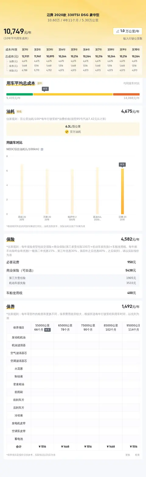 根据懂车帝官方的大数据分析,迈腾 2020款 330TSI DSG 豪华型的10年平均用车成本大约在11,538元/年,而这款车按照每年 1 万公里行驶里程计算,平均油耗约为6.8L/100km,年燃油费用大约5487元。这个用车成本相对来说还是比较合理的,毕竟这款车的性能和配置都比较出色,与同级别车型相比,这款车的燃油经济性也相对较高,因此这样的用车成本是可以接受的。