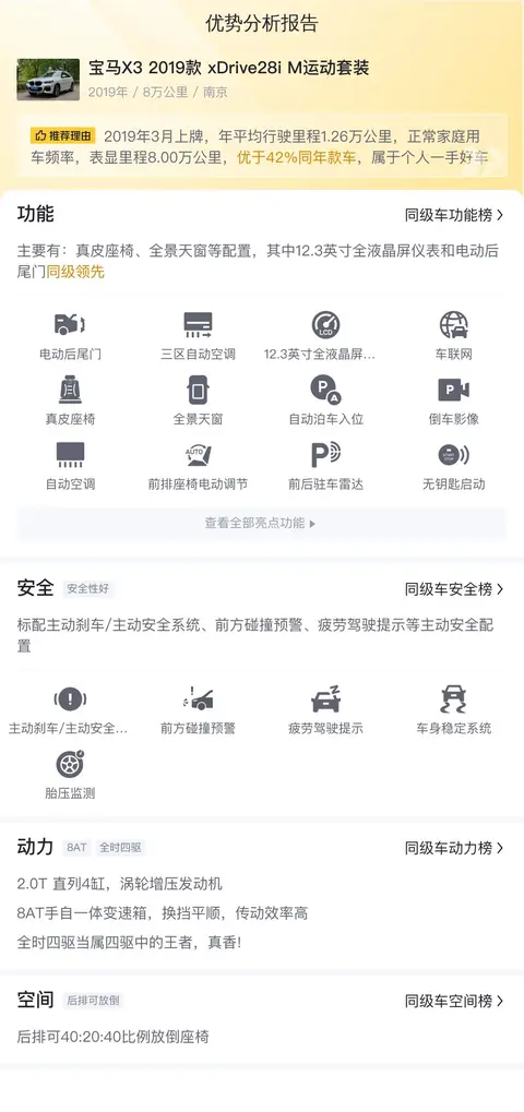 这辆宝马X3 2019款 xDrive28i M运动套装,2019年3月在南京上牌,行驶里程8万公里,外观白色,内饰深色,无过户记录。新车指导价42.58万,现在二手官方指导价16.58万。