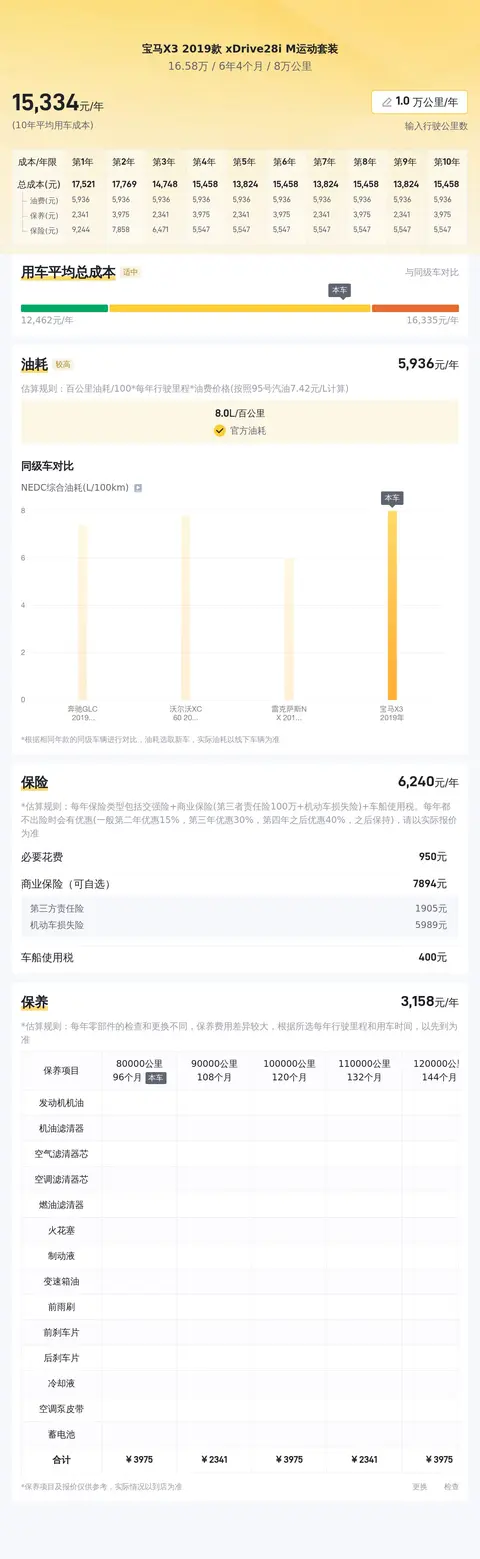 目前阶段,这款车的二手车市场行情大约在16.58万至20.15万之间,具体售价因车况而有所不同。至于用车成本方面,如上图,在百公里油耗8L的油耗水平下,该车的年平均成本大约在1.54万元左右(按每年行驶1万公里计),实际费用支出跟车主的用车习惯和行车环境有直接关系。