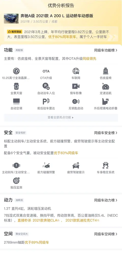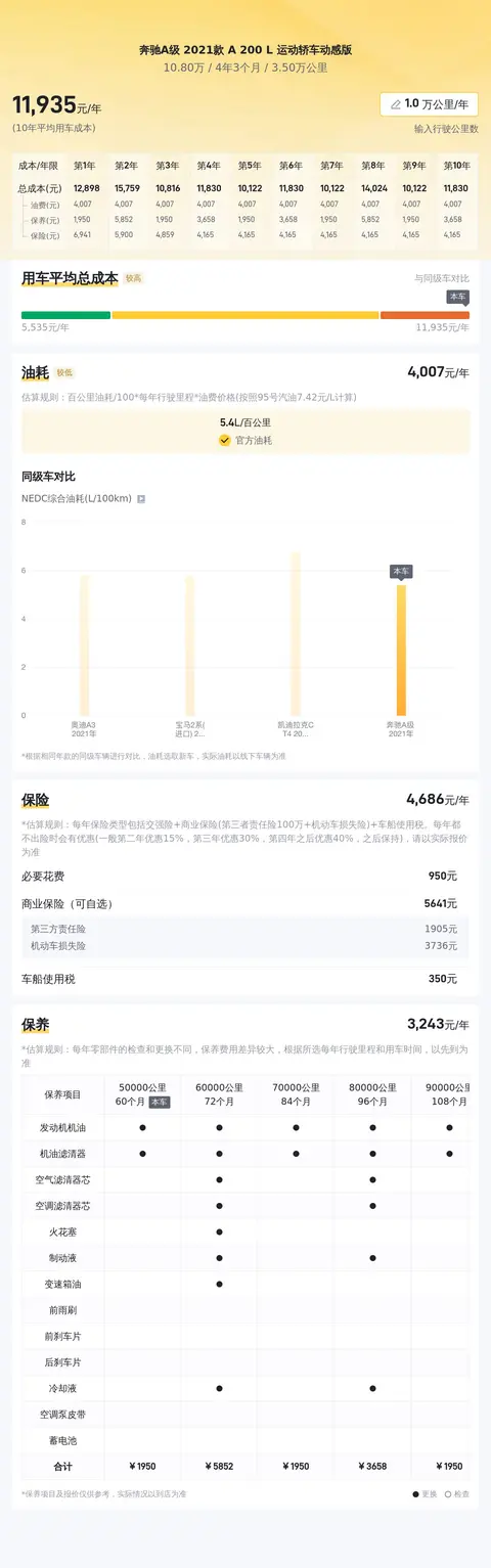 另外,根据估算,奔驰A级 2021款 A 200 L 运动轿车动感版的10年平均用车成本大约是12180元/年,而同级别车的最低用车成本是5673元/年,最高是14392元/年,所以它的用车成本偏高。