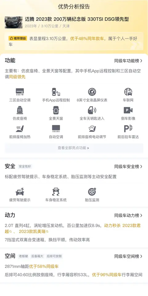 另外,迈腾 2023款 200万辆纪念版 330TSI DSG领先型,10年平均用车成本是6669元/年,而同级车的最低10年平均用车成本是6103元/年,最高是11462元/年,所以用车成本偏低。