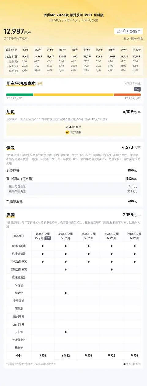 这辆传祺M8 2023款 领秀系列 390T 至尊版无论是从哪个方面来看,都能够很好的满足用户的使用需求,丰富的配置、舒适的乘坐体验、不错的动力表现,以及合理的市场定价,都是它的优点,同时根据估算,它每年的用车成本也并不算高,进一步提升了其实用性和性价比,是一辆值得考虑的二手车。