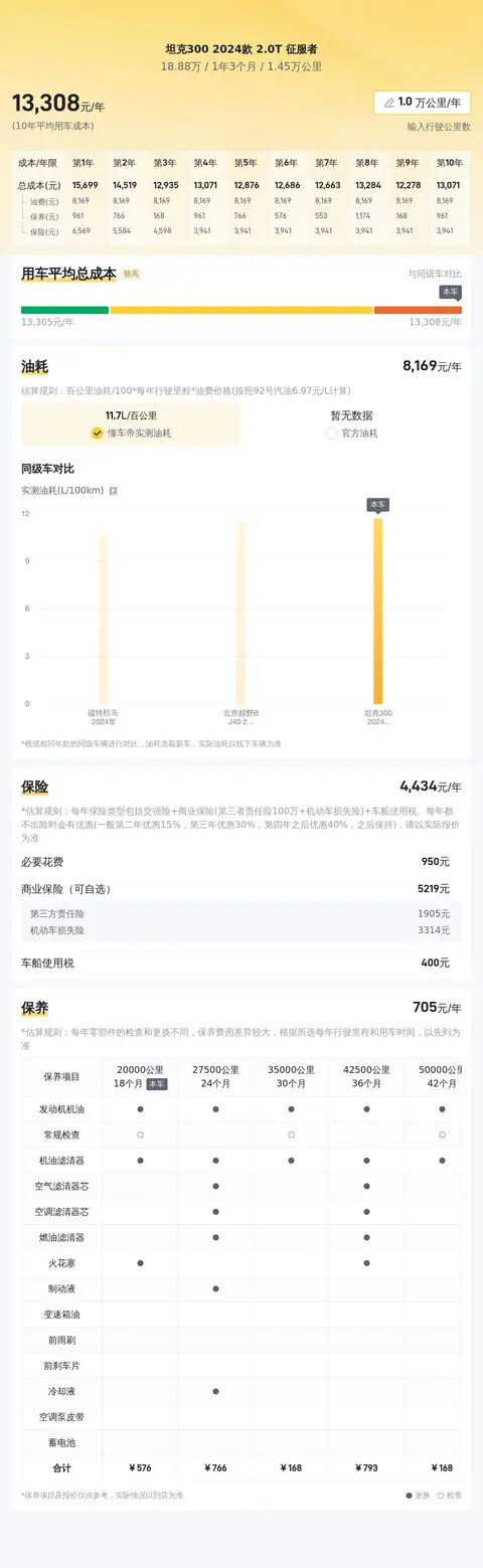 据估算,同级车的最低用车成本是5178元/年,最高是13461元/年,坦克300 2024款 2.0T 征服者是13218元/年,所以用车成本相对较高。