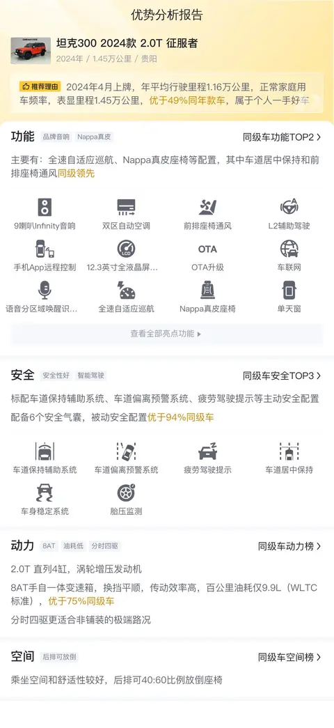 不可否认,坦克300确实为长城带来了很多流量,也打开了硬派越野的市场,让这款车成为了一时的爆款,热度居高不下。这款车子也是一方面,不到2年车龄,用的不多,整体还比较新,不过这个价位入手还是要考虑清楚,因为坦克300的舒适性真的不行,而且油耗也不低,用车成本高,更适合越野爱好者。