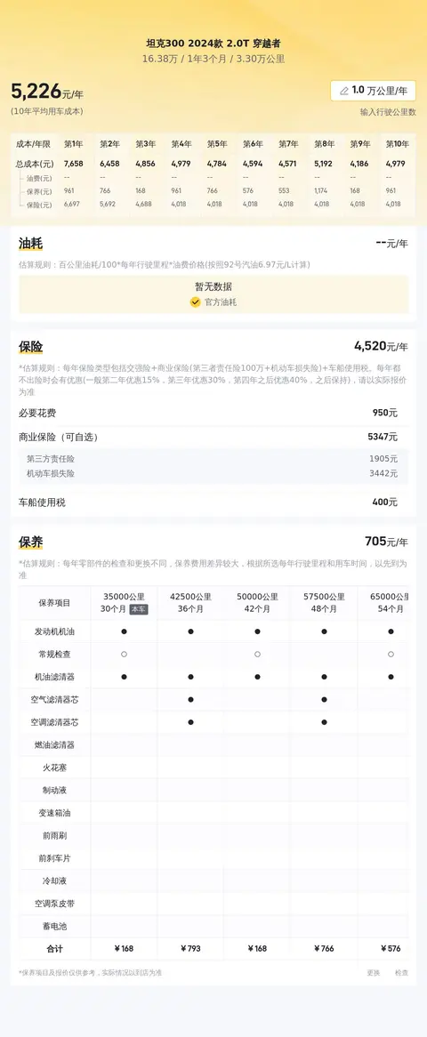 据估算,坦克300 2024款 2.0T 穿越者的用车成本是7131元/年,毕竟是越野车,有这个花费也算正常。