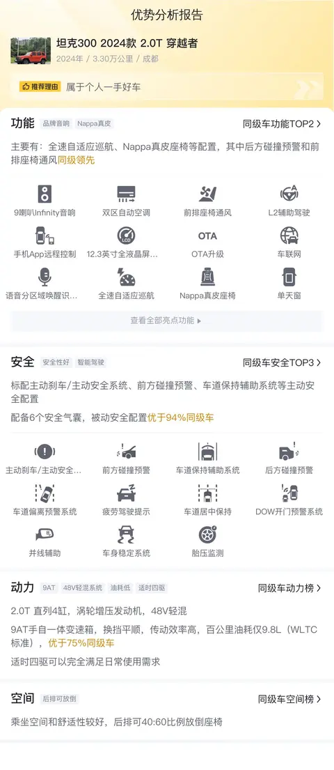 一年多的车,整体的配置还是很丰富的。坦克300 2024款 2.0T 穿越者配备了全速自适应巡航、Nappa真皮座椅、后方碰撞预警、前排座椅通风加热、方向盘加热和加热等配置。