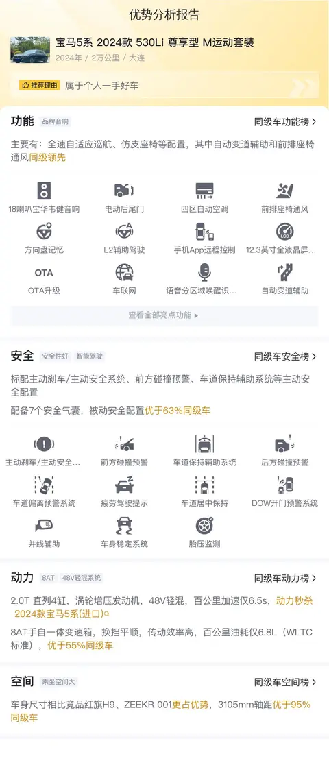 在配置部分,这款宝马5系配备有全速自适应巡航、L2辅助驾驶、自动泊车入位、3种驾驶模式可选、仿皮座椅等配置,其中自动变道辅助和前排座椅通风同级领先。在安全上,这辆车标配主动刹车/主动安全系统、前方碰撞预警、车道保持辅助系统等主动安全配置,配备6个安全气囊,被动安全配置优于78%同级车。