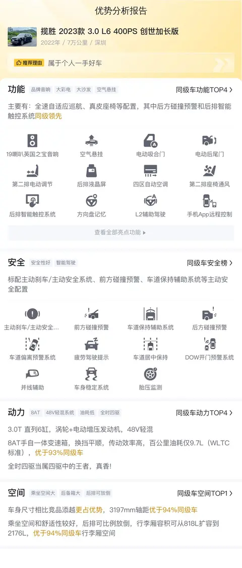 综上所述的新车含税价、用车成本、市场行情、优势分析、同款比价等数据仅供参考。在配置部分,因为二手车非标品,车辆可能会存在配置改装的情况,具体车况信息需要线下结合车辆实际情况进行综合参考。