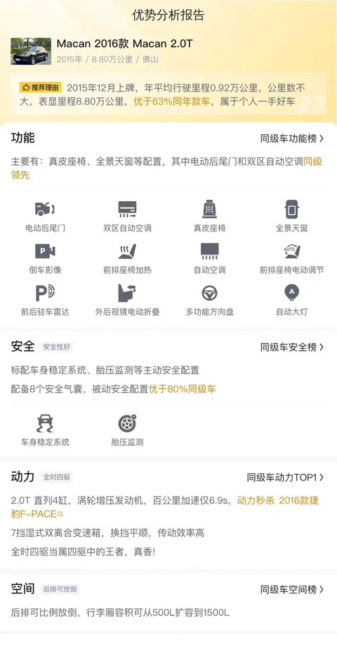 优势:保时捷的品牌知名度足够,Macan作为旗下热销车型,有着不错的市场欢迎度。动力强劲,配置丰富。自身的品质过硬,用着省心。再加上这辆Macan的价格实惠,入手压力不大。