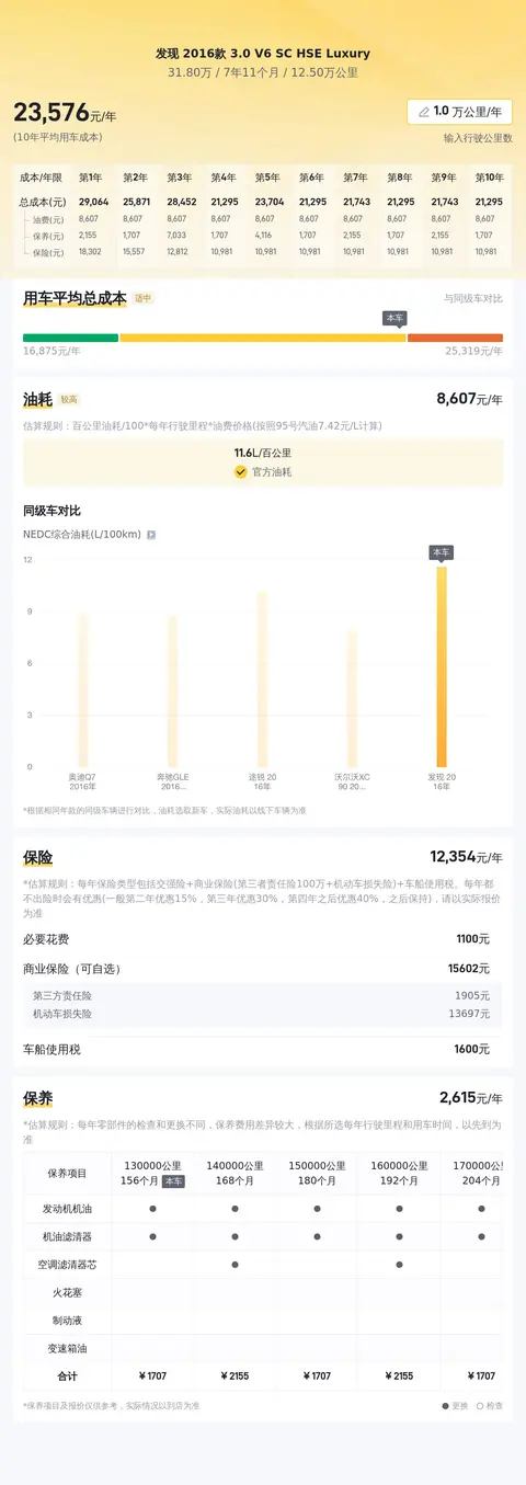 据估算,发现 2016款 3.0 V6 SC HSE Luxury的用车成本是23678元/年,同级车的最低用车成本是19464元/年,最高是31781元/年,所以它的用车成本不算低。