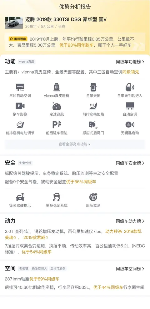 我们先来了解一下这辆车的基本信息,该车的具体版本是:迈腾 2019款 330TSI DSG 豪华型 国V,该车的定位是中型车,车身外观颜色为黑色,内饰是深色配色。车源地和上牌地都在长春。2019年8月首次上牌,在此期间过户0次。同时至今累计行驶里程是5万公里,该车符合国V排放标准。新车含税价为25.07万,而现在的二手车报价是10.08万。