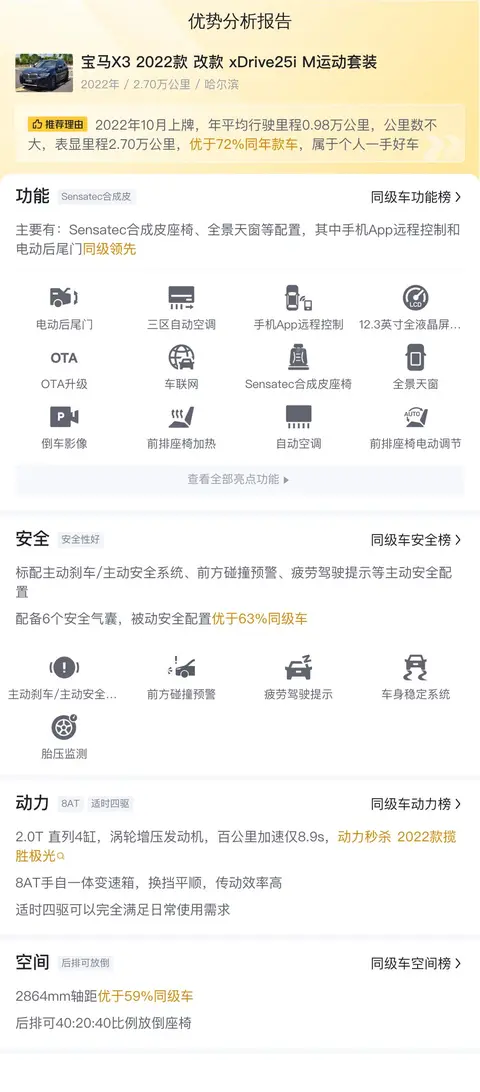 总的来说,宝马X3 2022款改款xDrive25i M运动套装是一款集豪华、性能与实用性于一身的SUV,无论是城市驾驶还是郊外探险,都能为驾驶者提供卓越的驾驶体验和舒适的乘坐感受。接下来,让我们看看今天这辆二手宝马X3表现如何。