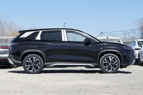 比亚迪宋 L DM 则展示了王朝设计理念的演进,追求更为繁复和精巧的观感。其前脸的灯组由一根醒目的银色饰条连接,下方宽大的多边形进气口内,密布着点阵式的镀铬细节,营造出一种带有纹理的精致感。一道清晰的腰线贯穿车侧,将视线引向车尾,而车顶的金属饰条则顺着窗沿一直延伸至D柱,增添了一份优雅。尾部独特的“中国结”式样灯组是其标志性特征,是对文化符号的巧妙借鉴。配合分段式扰流板及可点亮的品牌标识,让车尾在夜间更富层次感,整车透露出一种融合了现代工艺与传统意蕴的独特气质。