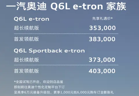 [懂车帝原创 产品] 日前,我们从官方获悉,一汽奥迪Q6L e-tron(图片|配置|询价)家族正式公布预售先享礼遇价,此次共推出4款车型,先享价区间35.3万-40.3万元。该车定位为纯电动中型SUV,提供传统SUV和Sportback轿跑SUV两种车身造型,搭载华为乾崑组合驾驶辅助,CLTC最高纯电续航里程765公里,此前新车已在奥迪一汽新能源工厂投产,接下来将于8月7日正式上市。