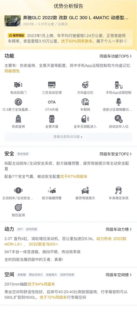 市场行情方面,这款车的售价在26.63-31.97万之间,具体售价因车况而有所不同。根据懂车帝大数据分析,该车在河北石家庄地区的市场占有率较高,保值率也较为理想。这款车的主要受众群体包括商务人士、家庭用户以及追求品质生活的消费者。他们注重车辆的品质、舒适性和安全性,同时也追求驾驶的乐趣和形象的展现。与同价位的奥迪Q5L和宝马X3相比,奔驰GLC在品牌影响力、豪华感和舒适性方面具有一定优势。综合考虑,对于追求豪华品牌、注重舒适性和品质的消费者来说,奔驰GLC是一个不错的选择。同时,也需要根据个人需求和预算做出合理的选择。
