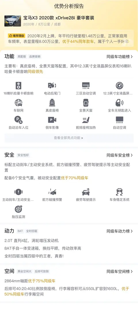 综上所述,这辆二手宝马X3 2020款 xDrive28i豪华套装以其合理的售价和较低的用车成本,成为了市场上的一款性价比较高的车型。在车况方面,该车外观内饰均保存良好,未发现有重大事故、火烧或水泡等问题,这也使得它在二手车市场中更具竞争力。在配置与体验方面,这款车的表现同样出色。无论是动力、空间还是舒适性配置都能满足消费者的需求。特别是其配备的全景天窗、电动后尾门等配置更是提升了车内的舒适性和实用性。此外宝马X3 2020款 xDrive28i豪华套装还配备了前后驻车雷达、倒车影像等多项安全配置为驾驶者和乘客提供了全方位的保护。这款车也存在一些不足之处。例如部分用户反映车辆悬架较硬,在颠簸路面上的舒适性有待提升。还有用户表示车辆的隔音效果一般在高速行驶时会有一定的风噪和胎噪。然而这些小缺点并不足以影响这款车的整体表现。毕竟每款车都有其特点和局限性。重要的是消费者可以根据自己的需求和预算来选择适合自己的车型。如果您正在寻找一款性价比高且车况良好的二手宝马X3那么这辆车无疑是一个值得考虑的选择。