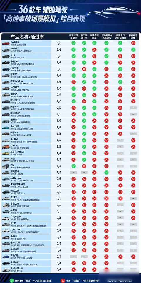 测试里可真没手软,比如高速上突然窜出事故车、施工路段卡车横插、前车消失这种神操作。特斯拉全过了,华为问界M9栽在卡车场景,小米SU7(图片|配置|询价)更惨,只过了一个项目。最离谱的是“猪突然冲出来”,35辆车全翻车,只有Model Y反应过来。