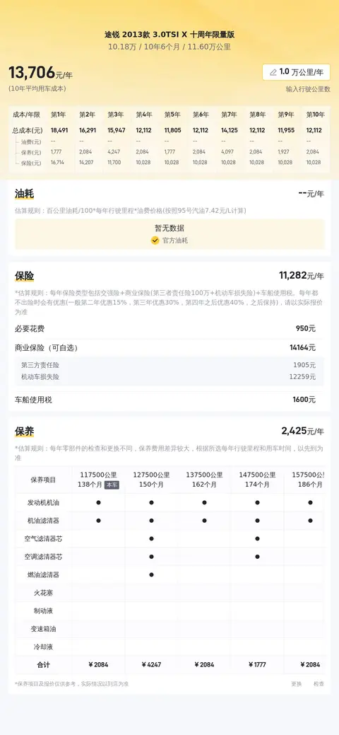 这辆途锐2013款 3.0TSI X 十周年限量版十年多的行驶里程为11.6万公里,年均行驶里程为1.1万公里,小于常规家庭用车频率,说明使用强度较低。这辆车有过1次过户史,说明车辆曾经变更过一次所有权。