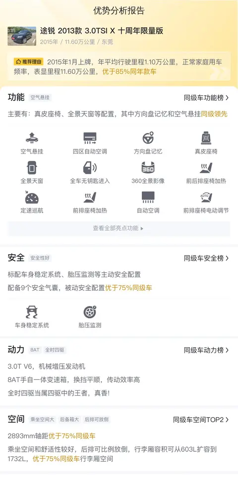 综上所述的新车含税价、用车成本、市场行情、优势分析、同款比价等数据仅供参考。在配置部分,因为二手车非标品,车辆可能会存在配置改装的情况,具体车况信息需要线下结合车辆实际情况进行综合参考。