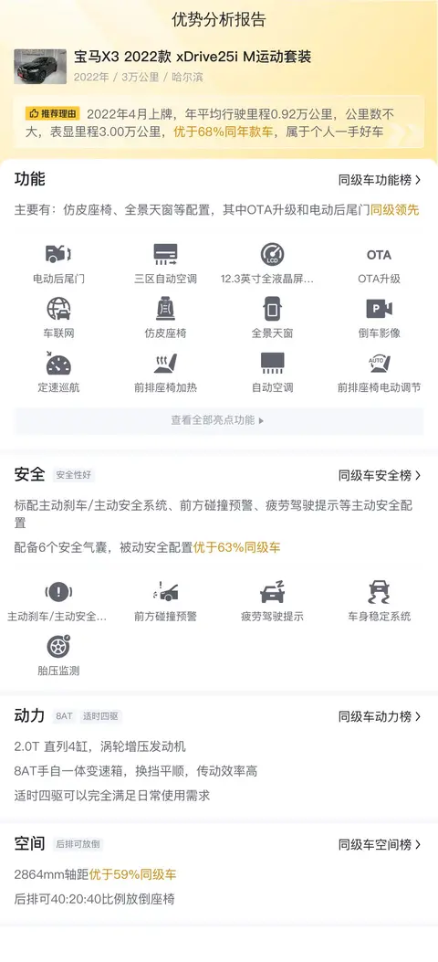 今天给大家带来的这台宝马X3 2022款 xDrive25i M运动套装二手车,它有着宝马品牌赋予的良好操控性及运动属性,得到了很多用户的认可。这台车是2022年04月在哈尔滨上的牌照,行驶了3万公里,二手车报价26.58万,这个价格还是有一定吸引力的。