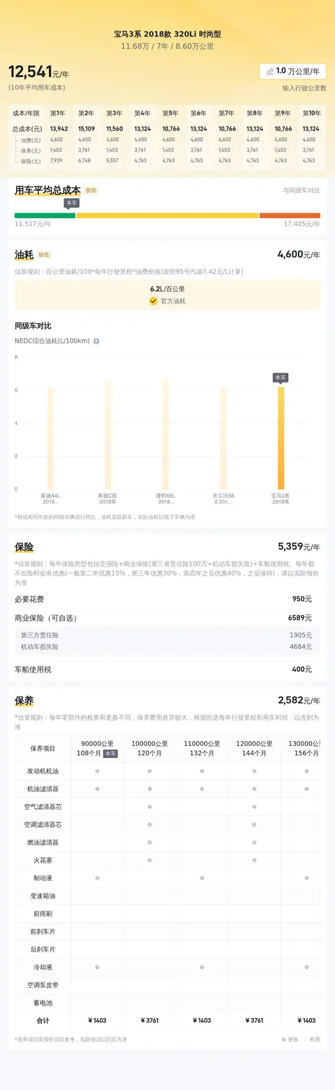 这辆宝马3系 2018款 320Li 时尚型10年平均用车成本是12679元/年,同级车的最低10年平均用车成本是11466元/年,最高是14621元/年,所以这辆车的用车成本适中。