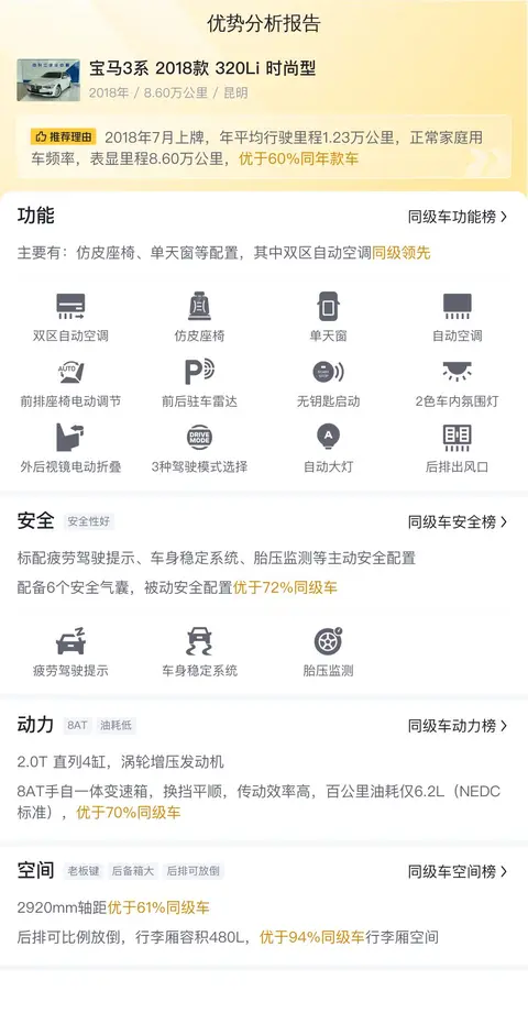 这辆宝马3系 2018款 320Li 时尚型优点是动力强劲,操控感强,品牌效应好,同级对比具有天然的吸引力。另外这辆车的轴距2920mm,后排乘坐空间宽敞舒适。再加上该车已行驶8.6万公里,正处于车辆性能最佳的时候,无需过多整备。