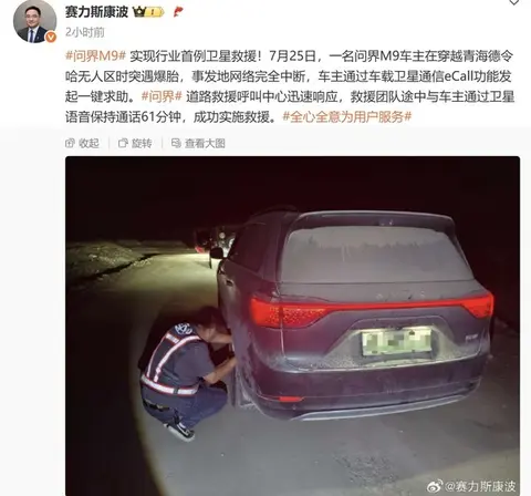 根据报道,7月25日,一名问界M9车主在穿越青海德令哈无人区时突遇爆胎,事发地网络完全中断,车主通过车载卫星通信eCall功能发起一键求助。问界道路救援呼叫中心迅速响应,救援团队途中与车主通过卫星语音保持通话61分钟,成功实施救援。