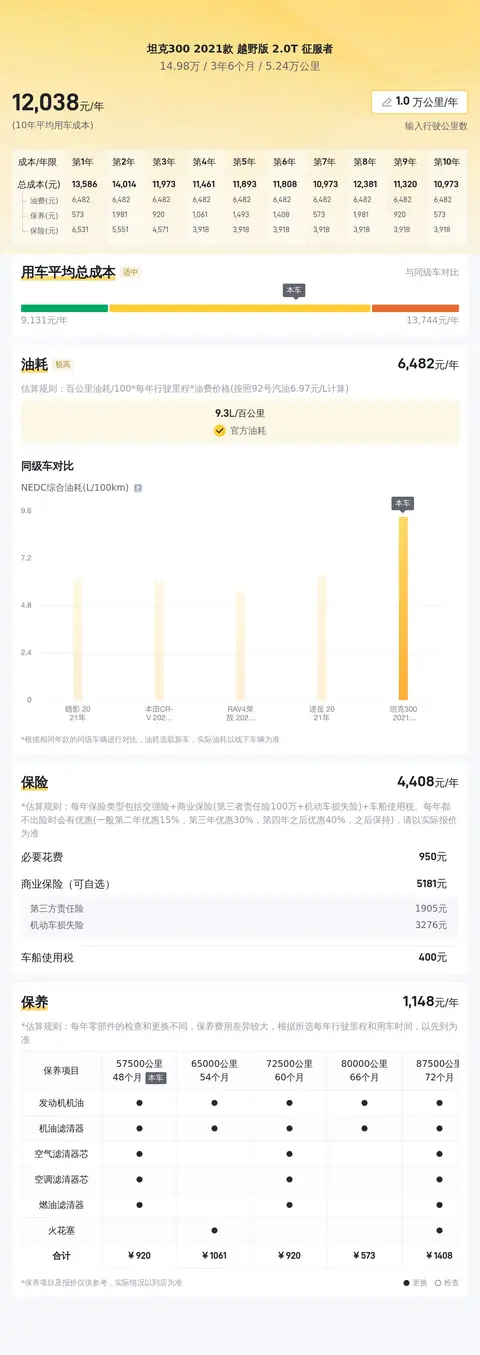 据估算,坦克300 2021款 越野版 2.0T 征服者的用车成本也低,因为同级车的最低用车成本是11709元/年,最高是17996元/年,而坦克300 2021款 越野版 2.0T 征服者是12179元/年,所以比较低。