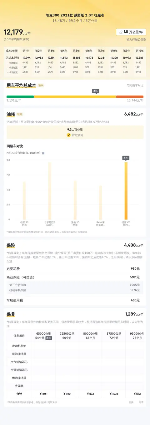 此外,我们还估算了坦克300 2021款 越野版 2.0T 征服者的平均用车成本。根据数据显示,这款车型的百公里油耗约为9.3升。结合当前油价(假设油价为8.02元/升),我们可以估算出这款车型每百公里的燃油费用大约为74.51元。这一数据为您提供了一个关于日常使用成本的参考。