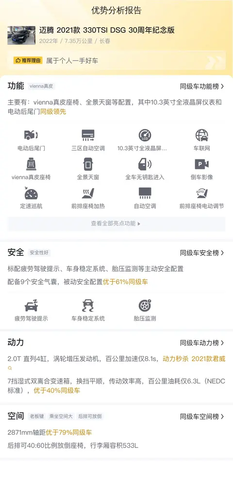 具体咱看这辆迈腾 2021款 330TSI DSG 30周年纪念版,车源地长春,上牌时间2022年7月,表显里程7.35万公里,新车指导价23.33万,二手车报价10.98万,约12.35万的差价。这车啊,看着挺新,用得不多,性价比还高,绝对算得上是辆好车。它呀,长得就精神,线条流畅,气质出众,开着它上路,那回头率,杠杠的!车内空间也宽敞,坐上去,腿脚都能伸展开,长途旅行也不怕累。动力呢,那是随叫随到,油门一踩,就带你飞驰,关键是油耗还低,省钱小能手一个。配置上,它可是满满的科技感,智能系统,安全装备,一样不少,用着放心,开着舒心。你要是想买辆二手车,这迈腾,绝对是个不错的选择,既实惠又实用,保准让你开着乐呵呵!