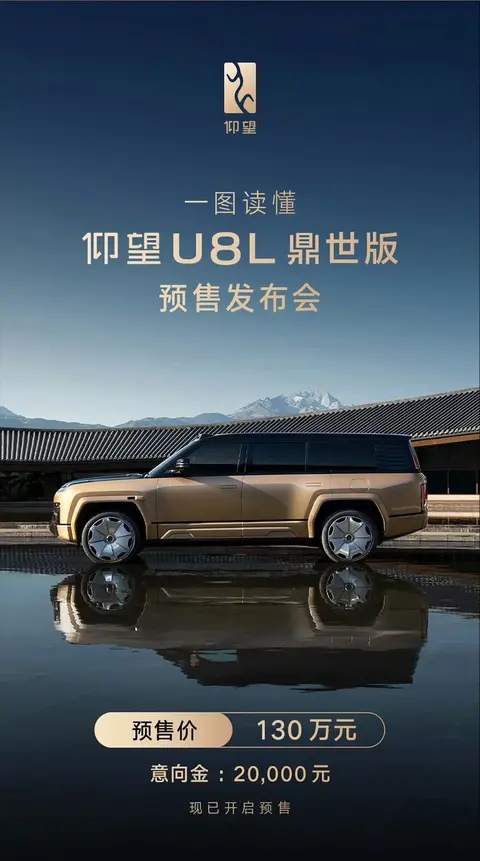 7月31日,仰望U8(图片|配置|询价)L鼎世版正式开启预售,预售价为130万元。仰望U8L鼎世版定位全尺寸SUV,其轴距达到3250mm,在仰望U8基础上将轴距大幅加长200mm,并采用6座布局。此外,新车还搭载易四方、云辇-P车身控制系统、三激光雷达辅助驾驶方案等诸多先进技术。