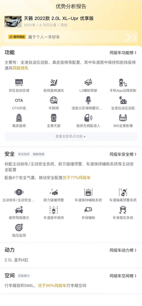 报价低于市场行情,天籁 2022款 2.0L XL-Upr 优享版的市场行情价是11.12万-13.62万,它的报价则是10.98万,较低的报价,以及较高的配置,让这车的性价比更高,同时保值率也较高。