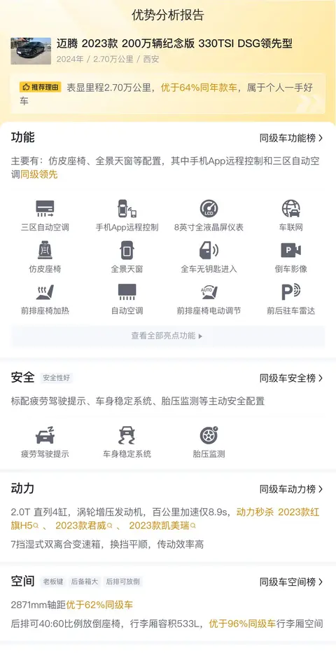 在同级别车型中,迈腾2023款200万辆纪念版330TSI DSG领先型具有多个方面的优势。首先,该车搭载的2.0T涡轮增压发动机在动力输出和平顺性方面表现出色,为驾驶者提供了更加出色的驾驶体验。其次,宽敞舒适的内部空间和丰富的配置也让迈腾在同级别车型中处于领先地位。再次,迈腾2023款200万辆纪念版330TSI DSG领先型拥有较高的保值率,未来几年内其二手市场价格相对稳定,为购买者提供了一定的保障。最后,迈腾2023款200万辆纪念版330TSI DSG领先型的燃油经济性也相当出色,使用成本较低,更加适合日常使用。综上所述,迈腾2023款200万辆纪念版330TSI DSG领先型在动力、空间、配置、保值率和燃油经济性等方面都表现出色,是一款值得推荐的中型轿车。