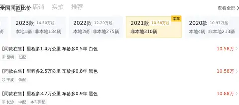 这辆车的表显里程4.28万公里,上牌日期2021年10月,上牌地车源地都是长沙,没有过户记录。新车指导价29.97万,目前二手车报价12.68万。