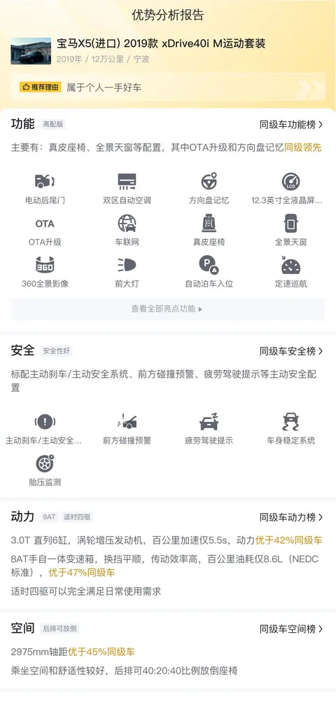 综上所述,这款宝马X5(进口) 2019款 xDrive40i M运动套装在二手车市场上展现出了极高的性价比。它不仅继承了宝马品牌的卓越品质和精湛工艺,更在动力、操控、舒适性和豪华感等方面给予了驾乘者非凡的体验。不论是日常通勤还是周末出游,它都能以出色的性能和迷人的魅力,陪伴您度过每一个精彩瞬间。如果您正在寻找一辆既能提供驾驶乐趣,又能展现个性风采的中大型SUV,那么这款宝马X5无疑是一个值得考虑的选择。