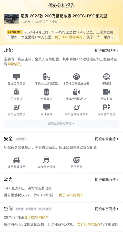综上所述的新车含税价、用车成本、市场行情、优势分析、同款比价等数据仅供参考。在配置部分,因为二手车非标品,车辆可能会存在配置改装的情况,具体车况信息需要线下结合车辆实际情况进行综合参考。