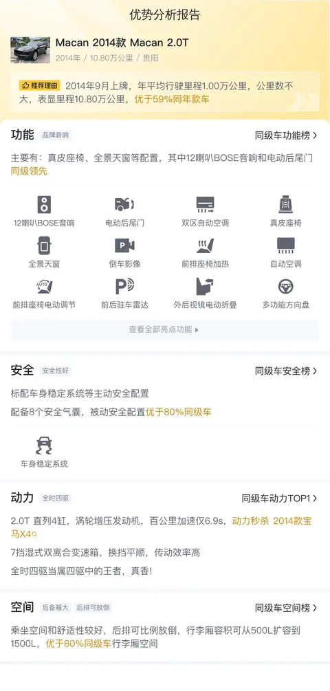 这辆Macan 2014款 Macan 2.0T的优势非常明显,毕竟是保时捷家族的产品,在动力上全时四驱当属四驱中的王者,同时12喇叭BOSE音响和电动后尾门同级领先,这些配置即便是放在现在也很能打。