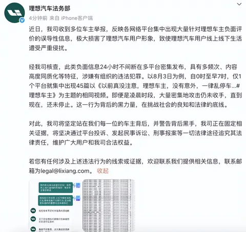 8月7日上午,理想汽车法务部发布声明称,公司收到多位车主举报,反映各网络平台集中出现大量针对理想车主负面评价的误导性信息,极大损害了理想汽车用户形象,致使理想汽车用户线上线下生活遭受严重侵扰。经公司核查,此类负面信息24小时不间断在多平台密集发布,具有多频次、内容高度同质化等特征,涉嫌有组织的违法犯罪。对此,理想汽车正在固定相关证据,将坚决通过平台投诉、发起民事诉讼、刑事报案等一切法律途径追究其法律责任。