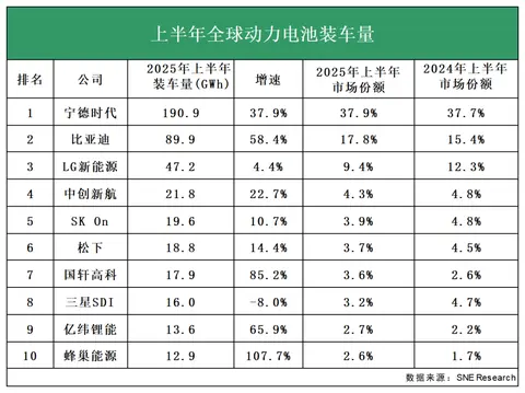 其中,宁德时代是全球唯一一家动力电池装车量超过100 GWh的企业,以190.9 GWh的装车量占据了全球37.9%的市场份额;紧随其后的比亚迪,上半年动力电池装车量达89.8 GWh,市占率达到17.8%;中创新航以21.8 GWh的动力电池装车量占据了全球4.3%的市场份额,排在第四位;国轩高科升至第七位,上半年的动力电池装车量为17.9 GWh,占据全球3.6%的市场份额;亿纬锂能和蜂巢能源依次位列第九至十名,市占率分别为2.7%和2.6%。