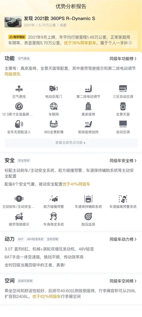 这辆发现 2021款 360PS R-Dynamic S的优势非常明显,首先是价格,现在只要四十万出头,原版原漆的车况让人省心又省钱,其次这辆发现 2021款 360PS R-Dynamic S的舒适配置丰富,同级领先的第二排电动调节、真皮座椅、全景天窗,都能提高乘车的舒适度,最后是动力,3.0T直列6缸发动机,动力强悍,能满足偶尔越野的需求。