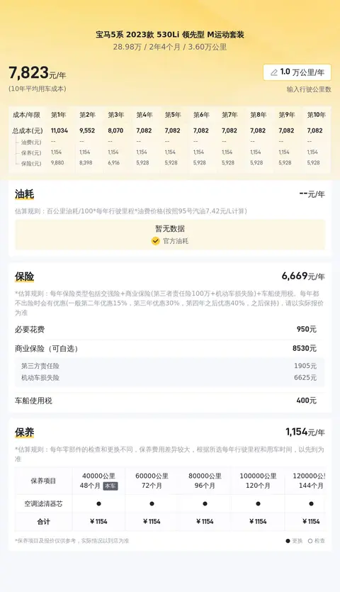 根据懂车帝的数据,这款宝马5系 2023款 530Li 领先型 M运动套装的二手车市场价格区间为25.02万至30.12万。而该车的售价为28.98万,位于市场价合理范围内,且符合该车况应有定价。这款车的热度较高,预计在30天内售出,保值率也较高,是一个不错的选择。在用车成本方面,这款车的10年平均成本约为13667元/年,与同级别车相比适中。燃油成本方面,WLTC综合油耗为7.8L/百公里,约为6688元/年,与同级别车相比处于较高成本。保养方面,每年约5380元,与同级别车相比偏高。保险方面,每年约5437元,与同级别车相比偏高。这辆车目前首付8.66万就可以开回家,分期三年,利息低,大大降低了购车门槛,让您可以轻松拥有这款梦想之车。同时,选择分期购车还能让您手中的资金更加灵活,有更多的机会去做投资或者其他的财务安排。而且,分期购车还能提升您的信用额度,让您的金融生活更加顺畅。最后,分期购车还能让您避免一次性支付大额款项带来的经济压力,让您可以更加轻松地享受购车的乐趣。