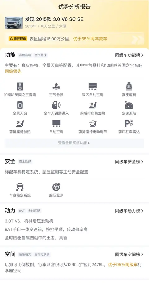 发现3 2015款 3.0 V6 SC SE在配置和性能方面表现出色,与同级别车型相比具有一定的优势。它的内饰豪华舒适、动力性能强劲、底盘悬挂稳定、制动系统先进且安全配置齐全。是一款集豪华、性能和安全性于一身的中大型SUV,适合那些追求高品质生活和驾驶体验的消费者。作为一款二手车,它也具有较高的性价比和市场竞争力。