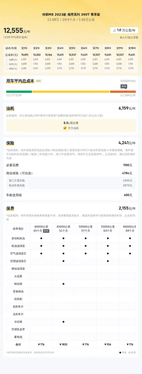 关于用车成本部分,这辆车的官方百公里油耗是8.7L,按照这个油耗计算,该车每年的油费大约需要7256元,保险费用参考值为4631元,保养费用约为4038元,年均综合用车成本约15925元,这项花销是跟车主的用车场景和用车强度有直接变化的。