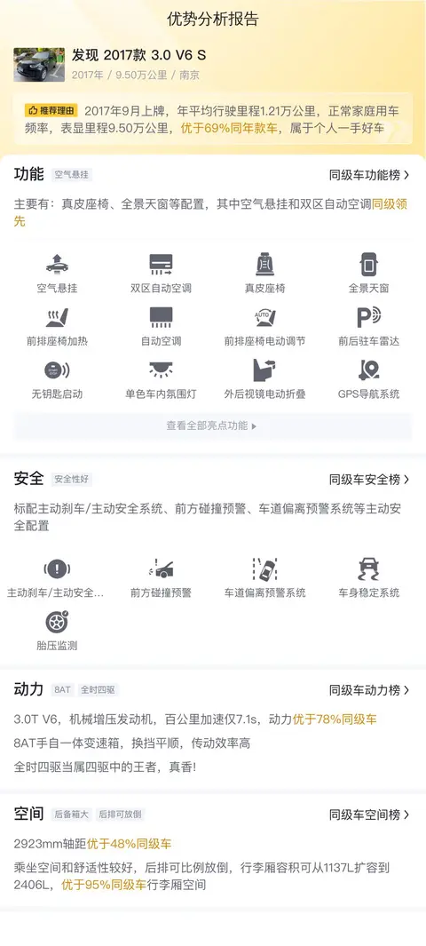 在车身尺寸方面,这辆二手路虎发现 2017款 3.0 V6 S的长宽高分别为4970mm、2073mm、1913mm,轴距为2923mm。这样的车身尺寸使得车内空间非常宽敞,无论是前排还是后排乘客都能享受到舒适的乘坐体验。同时,该车的行李厢容积也非常可观,达到了1137L-2406L,能够轻松应对各种出行需求。在对比同级车时,该车在轴距和行李厢容积方面都表现出色,可以说是一个“大块头”了!