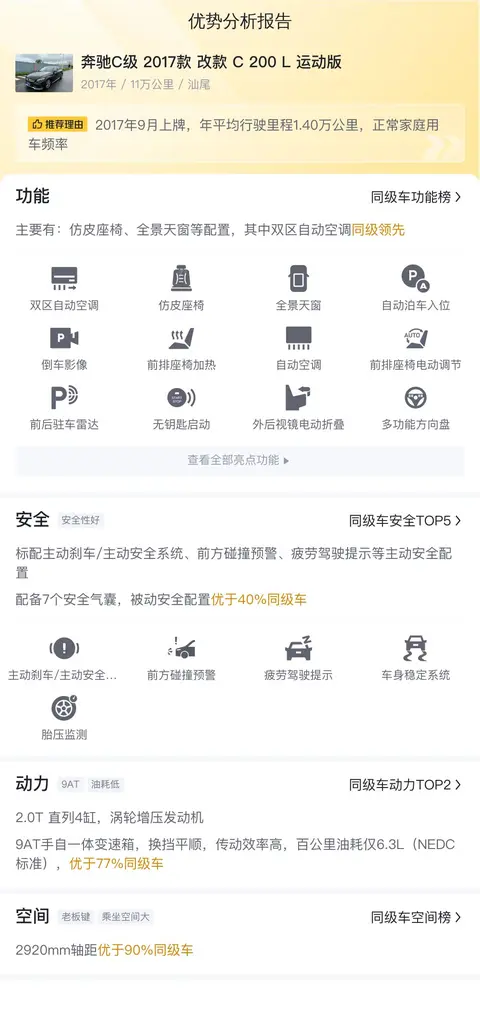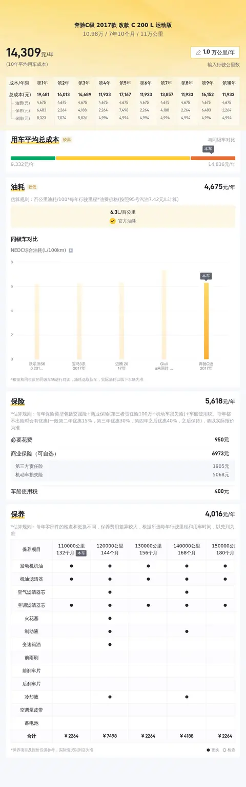 据估算,同级车的最低用车成本是13598元/年,最高是17786元/年,奔驰C级 2017款 改款 C 200 L 运动版是14463元/年,所以用车成本适中。