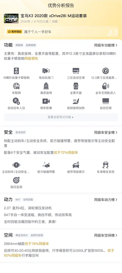 在与同级别竞品的对比中,2020款宝马X3 xDrive28i M运动套装在动力性能、操控性、品牌影响力等方面具有明显优势。同时,这款车也存在一些不足之处,如内饰材质、配置丰富度等方面的提升空间。总体而言,2020款宝马X3 xDrive28i M运动套装是一款集豪华、动感与实用于一体的中型SUV,既能提供出色的驾驶体验,也能满足家庭出行的需求。