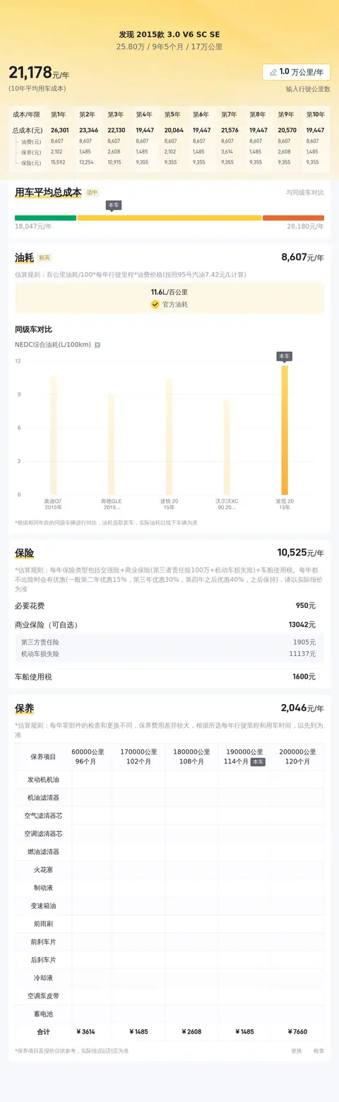 用车成本也是每个车主必须考虑的问题。经测算,这辆车的十年平均用车成本约为21270元/年,具体费用因人而异。