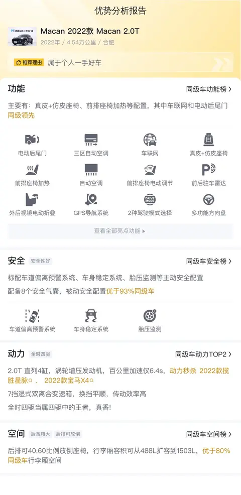这辆Macan 2022款 Macan 2.0T的优势非常明显,保时捷家族当红车型,出行可以获得非常高的回头率,开着它去把妹也是正正好好。运动化取向的底盘调校,可以让您在山路上享受到人车合一的驾驶乐趣。