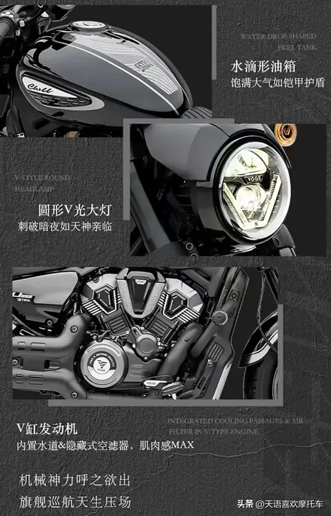 其次,颜值方面:CU625外观方面依然继承了无极巡航家族式的设计,标志的水滴型油箱,饱满大气,圆形V光大灯设计,V缸发动机,满满的肌肉感,平直手把、分体式坐垫勾勒出经典Bobber轮廓,颜值还是很在线!